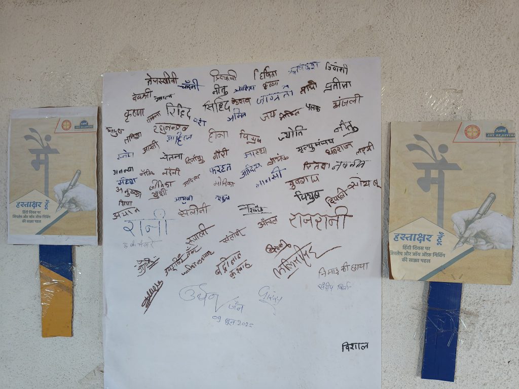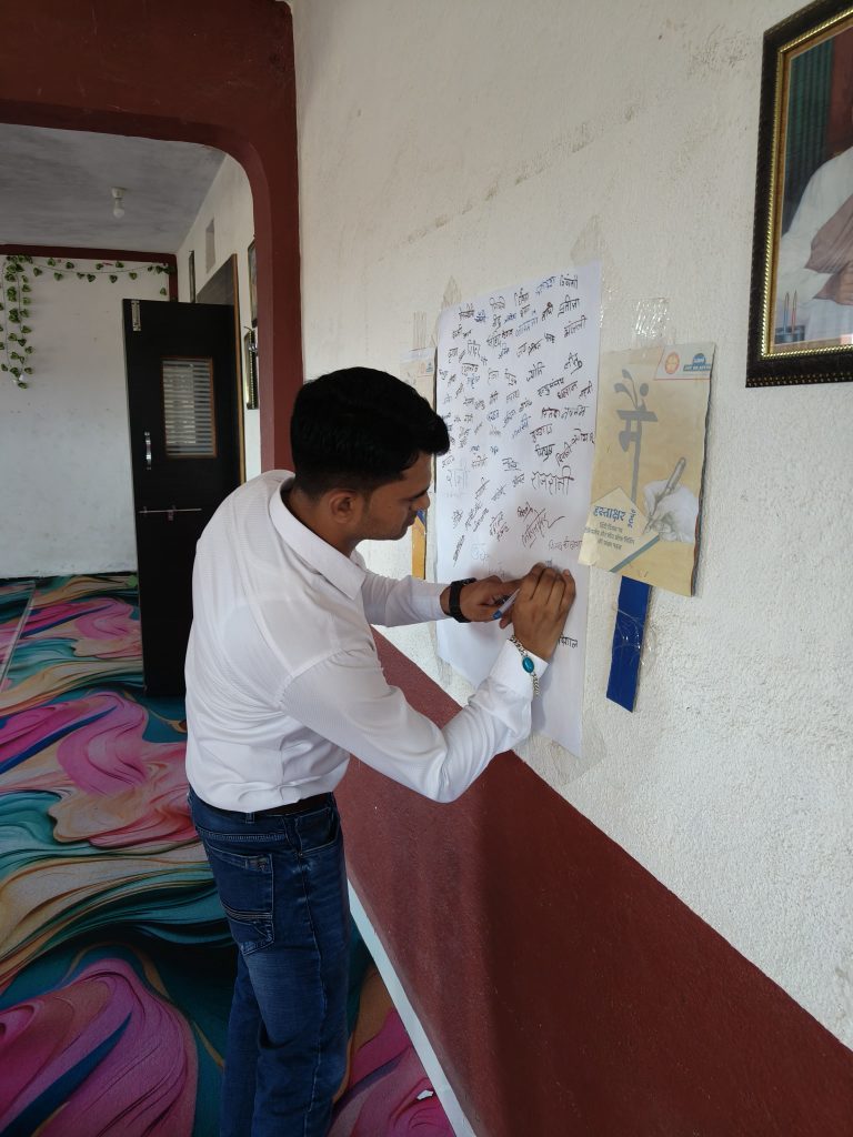 भीकनगाँव। मातृभाषा उन्नयन संस्थान द्वारा संचालित हस्ताक्षर बदलो अभियान कवि कृष्णपाल सिंह के नेतृत्व में गोराड़िया ग्राम स्थित ज्ञान सागर हाई स्कूल में पहुँचा। छात्रों ने अपने हस्ताक्षर अन्य भाषा से बदलकर हिन्दी में करने का निर्णय लिया।