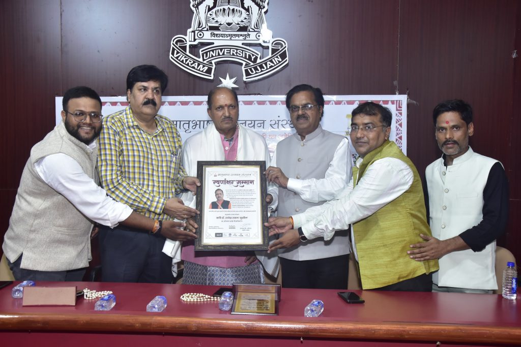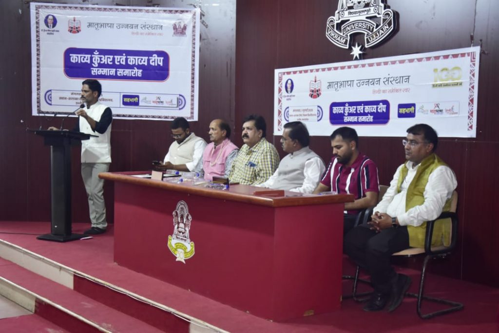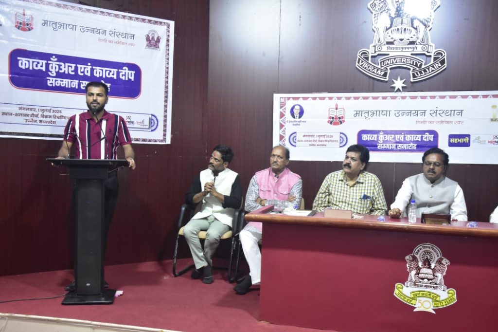 उज्जैन। हिन्दी कवि डॉ. कुँअर बेचैन की जन्म जयंती पर मातृभाषा उन्नयन संस्थान, डॉ. कुँअर बेचैन स्मृति न्यास, ऑस्ट्रेलिया और विक्रम विश्वविद्यालय के संयुक्त तत्त्वावधान में काव्य कुँअर 2025 व काव्य दीप सम्मान समारोह का आयोजन मंगलवार को शलाका दीर्घा में सम्पन्न हुआ। आयोजन की अध्यक्षता विश्वविद्यालय के कुलगुरु प्रो. अर्पण भारद्वाज ने की। मुख्य वक्ता कुलानुशासक डॉ. शैलेंद्र कुमार शर्मा व विशिष्ट अतिथि अधिवक्ता अनंत यादव रहे। अतिथि स्वागत पंकज प्रजापत, पारस बिरला, संदीप सृजन ने किया। स्वागत उद्बोधन संस्थान अध्यक्ष डॉ. अर्पण जैन ‘अविचल’ ने दिया।