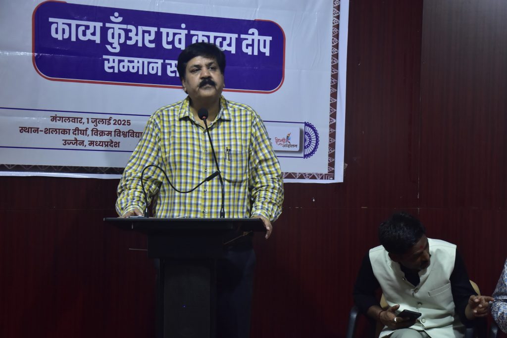 कार्यक्रम में विक्रम विश्वविद्यालय के कुलपति ने कहा कि ‘जो कवि मानवता के लिए लिखते हैं, वे कालजयी हो जाते हैं।’ उन्होंने कहा कि ‘कविता केवल सौंदर्य का माध्यम नहीं, बल्कि संवेदना और सामाजिक चेतना का उद्घोष है।’ अध्यक्षीय उद्बोधन में प्रो. अर्पण भारद्वाज ने कहा कि ‘कविता अपने संस्कारों के माध्यम से राष्ट्र का वंदन करती है।’ उन्होंने कहा कि ’आज की युवा पीढ़ी भी कविता के ज़रिए राष्ट्र जागरण में जुटी है, जैसे स्वतंत्रता संग्राम में कवियों की भूमिका थी। वेदना को शब्द देना माँ वागेश्वरी का वरदान है, जो नवांकुरों को प्राप्त हो रहा है।’ उन्होंने युवा रचनाकारों से अपील की कि वे जनभावनाओं और सामाजिक सरोकारों को अपनी रचनाओं में स्थान दें और कविता को जनचेतना का माध्यम बनाएँ।